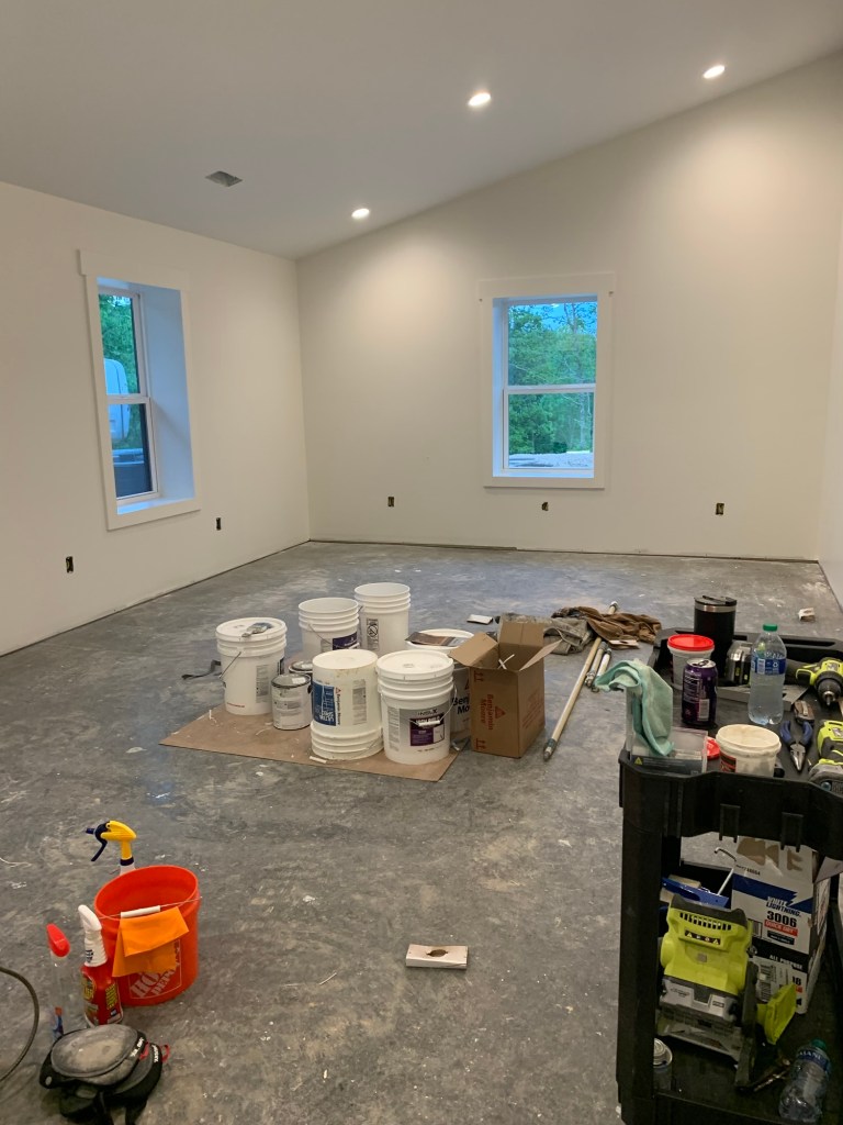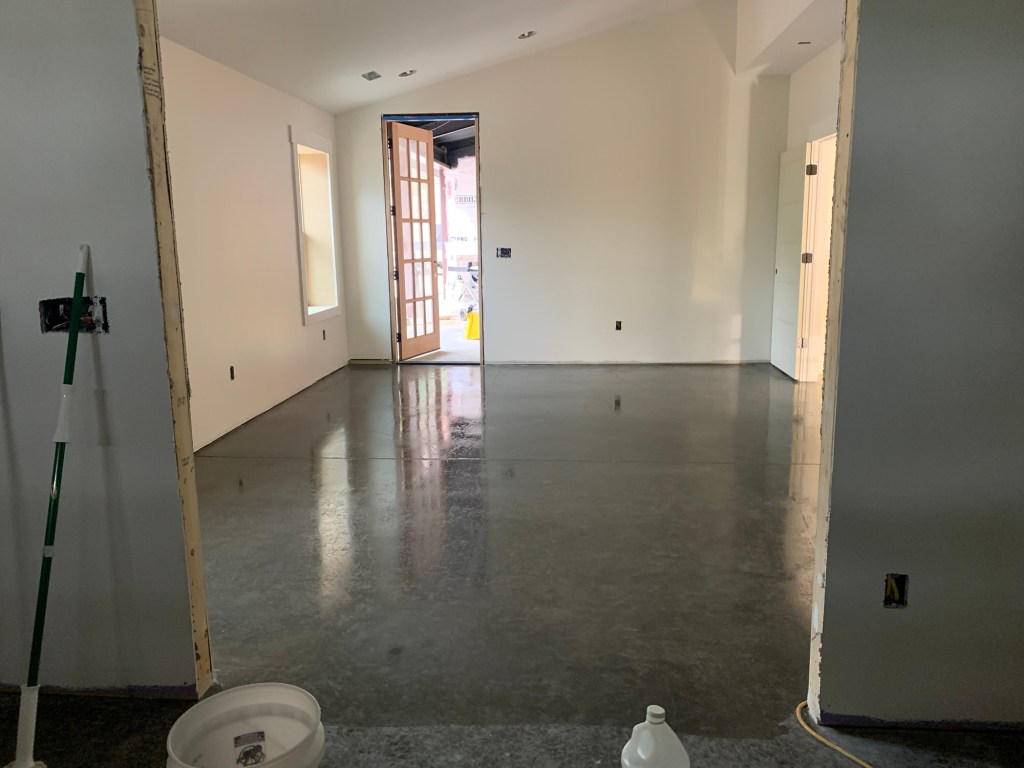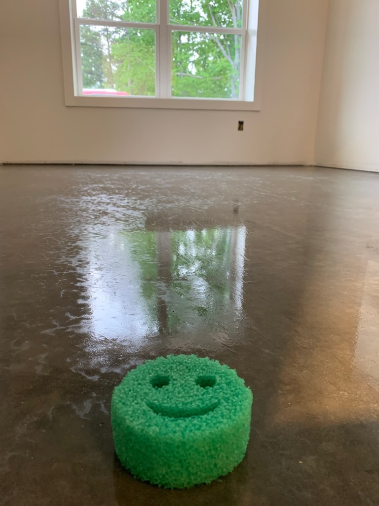 Once the sheetrock was finished, it was time for me to scrape and clean sheetrock mud and dust from all 4500 square feet of concrete in the house. Unless you’ve done it, you don’t know how brutal that job can be! The method that worked best in our situation involved vacuuming with a HEPA filter in the shop vac, mopping with vinegar solution, rinsing, and then working on hands and knees with a razor blade scraper, straight vinegar, and a scrub daddy scrubber.