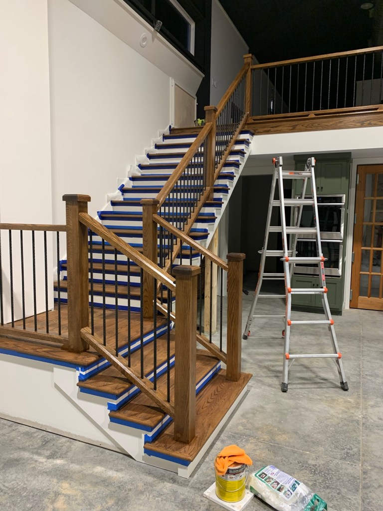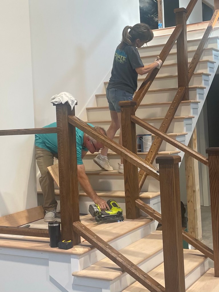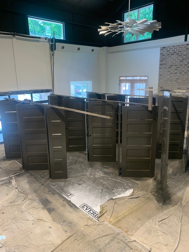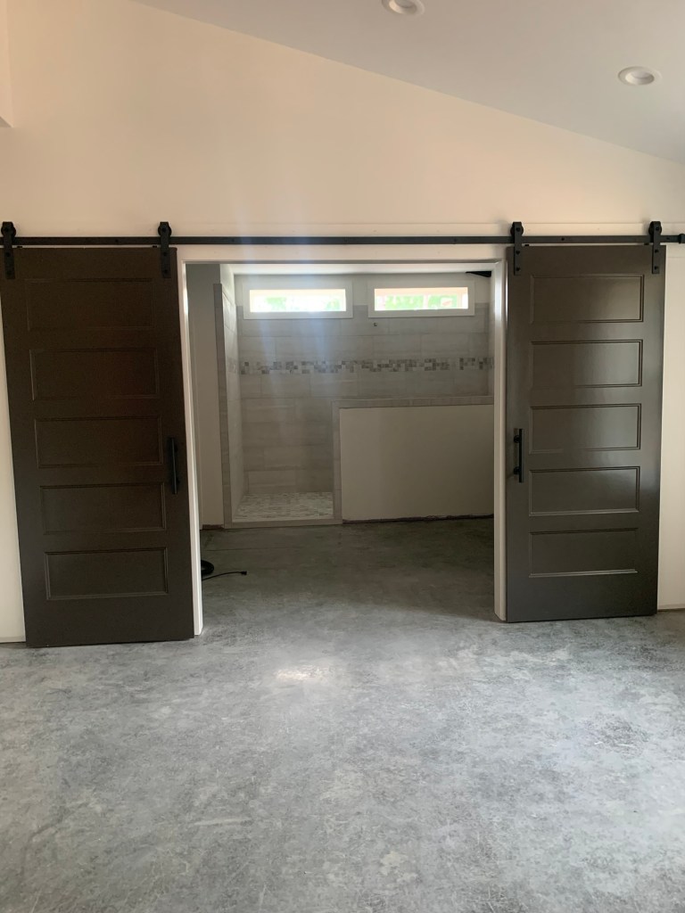 As the summer went on, we installed 1000 square feet of LVP flooring in the loft, hung rail doors, painted and installed rebar balusters, stained the stairs and balcony trim, and started doing all the interior trim. As of this post a year later, we are still trying to finish all of the baseboards and shoe moulding. We are getting close.