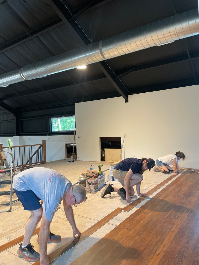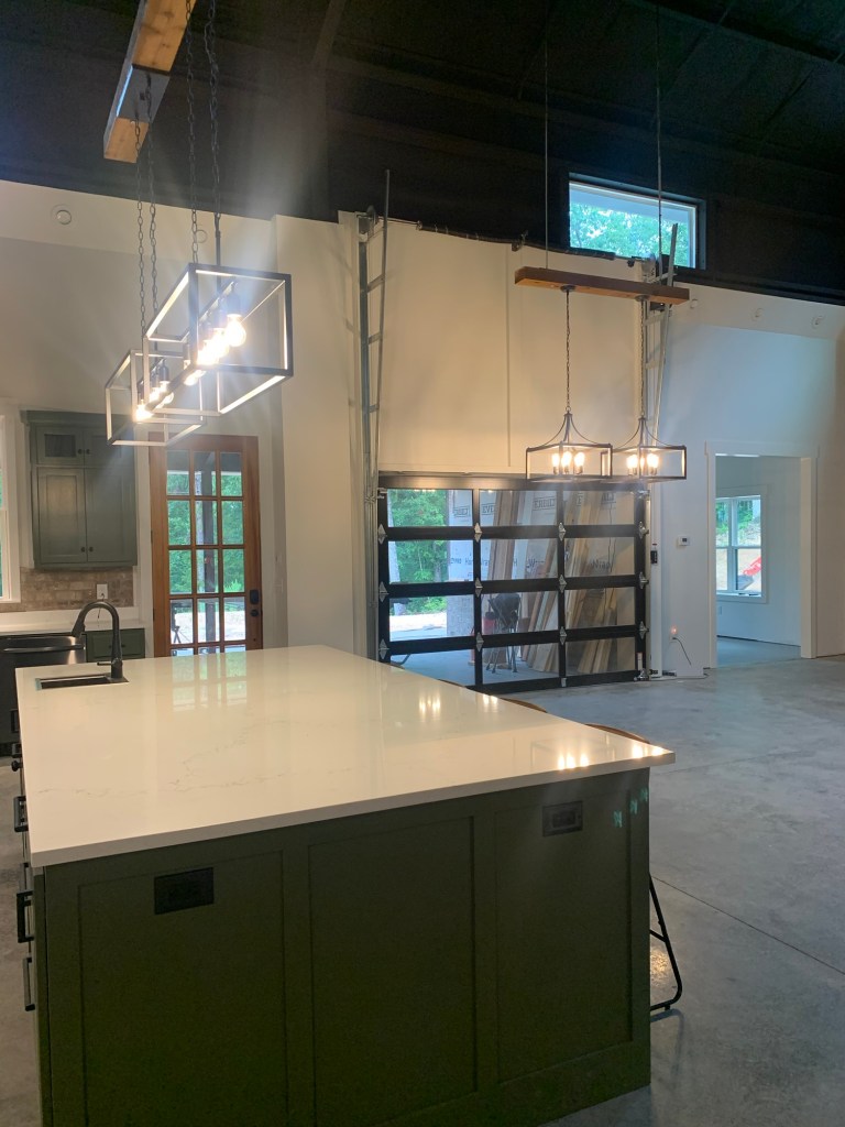The company we hired for electrical is operated by a father and his two sons, and we’ve known them since the sons were little kids. They were dependable and professional and also willing to brainstorm with Tim to make some of his out of the ordinary ideas come to life. We used simple fixtures from Home Depot and cedar beams to make unique lighting solutions for the island and dining table, and it all had to be hung from a ceiling height of almost 30 feet.