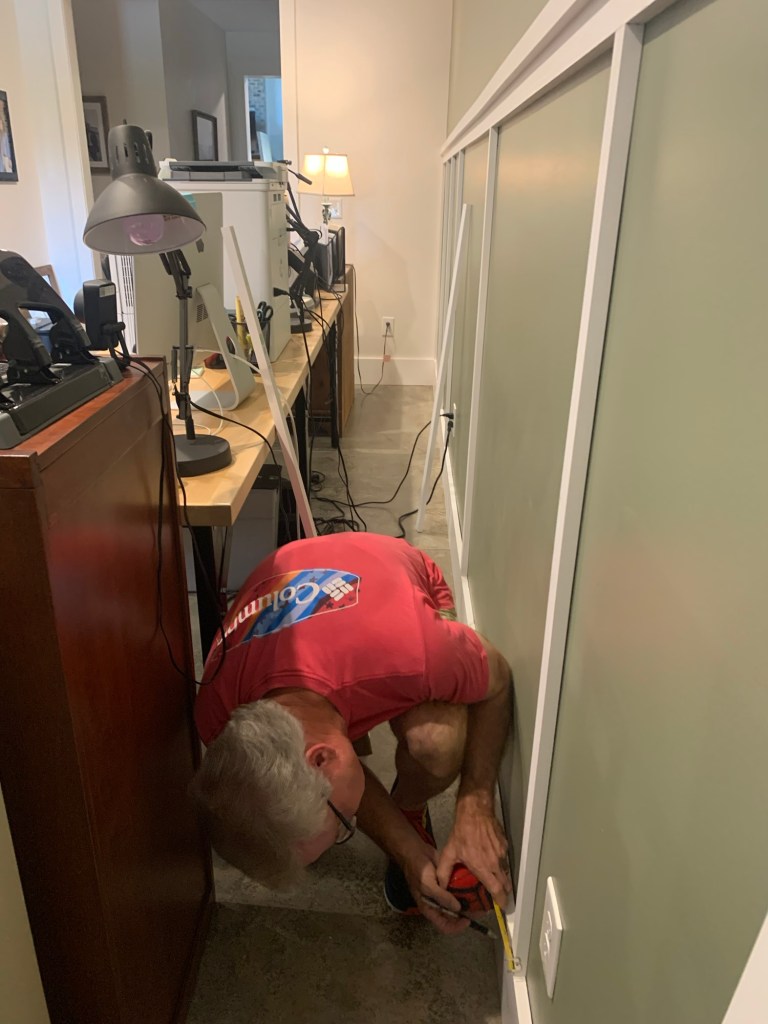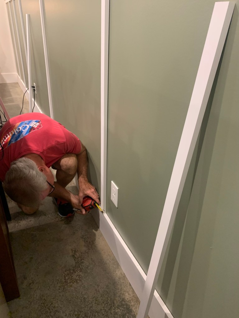 Tim figured out the math to make the nine spaces work out equally and installed the vertical trim using a heavy duty adhesive since they didn’t line up with studs. I was his right hand (wo)man as usual. I am developing a keen sense of when to jump in and when to stay out of the way based on complicated calculations involving how much he is sweating, whether or not he still has caffeine coursing through his veins, and how many times his nail gun has jammed.