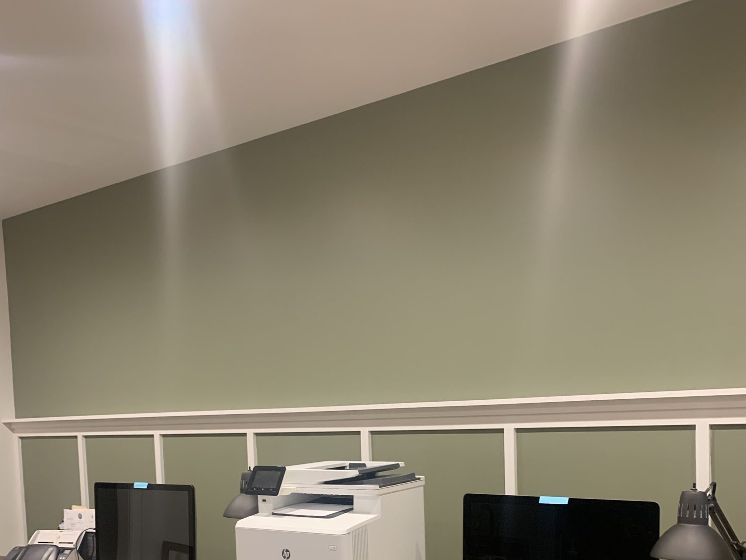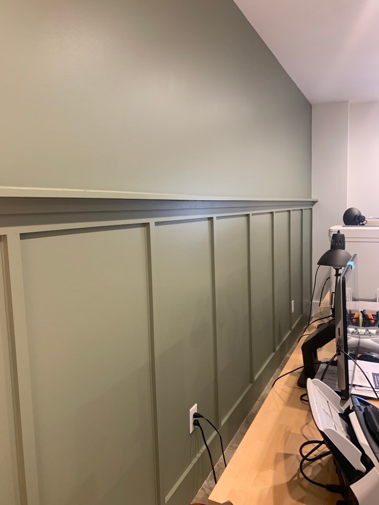Our latest project was quick and easy, relatively speaking. When we decided to do a combo home office/laundry room space, I knew I wanted an accent wall. I chose to use Benjamin Moore Jade Romanesque which turned out beautifully, but it would be months before we had time to add the trim and picture rail.