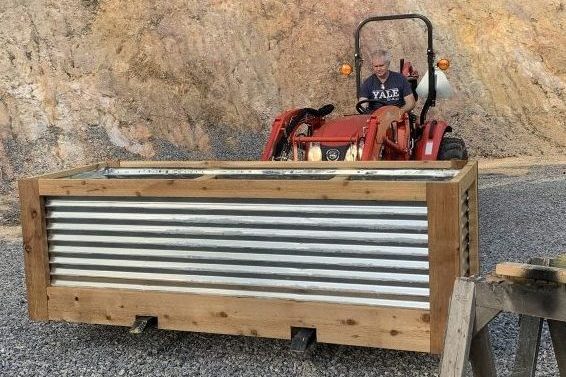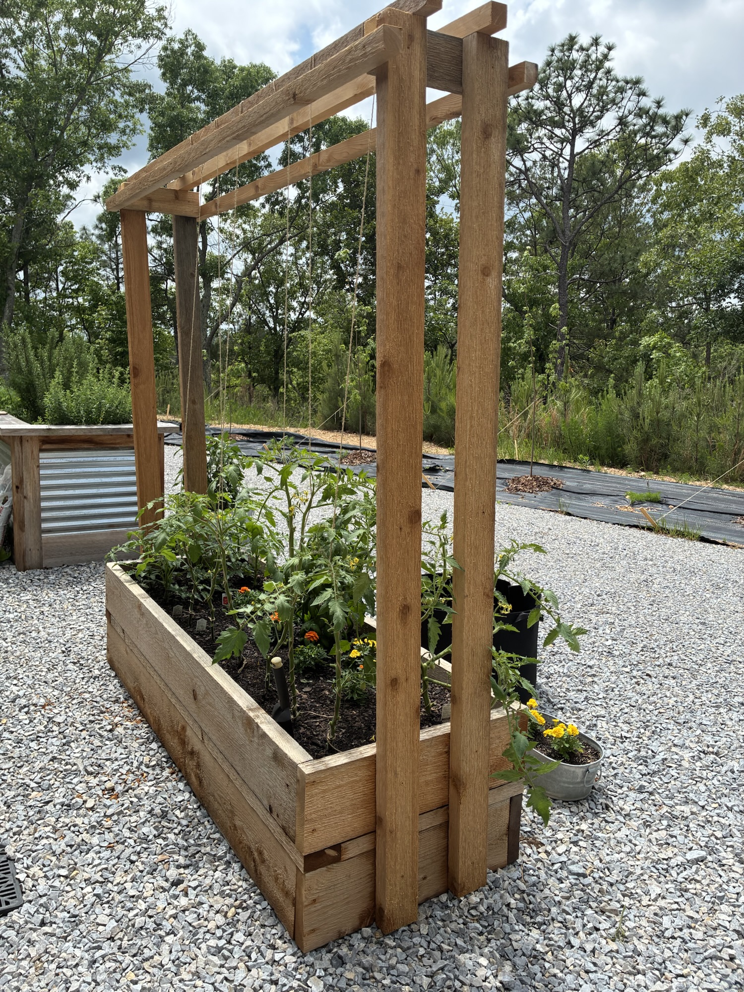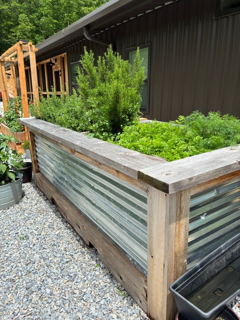 Since he also enjoys woodworking, Tim has started making lovely raised beds with leftover cedar from our build. Last year he made this large bed with notches for the tractor forks so he could easily move it around. The galvanized metal was leftover from building our shop.