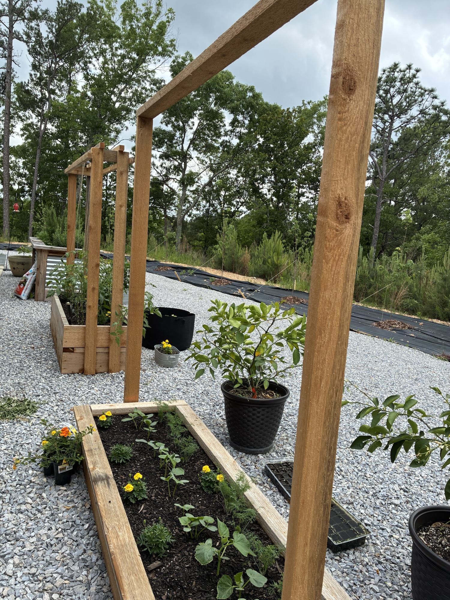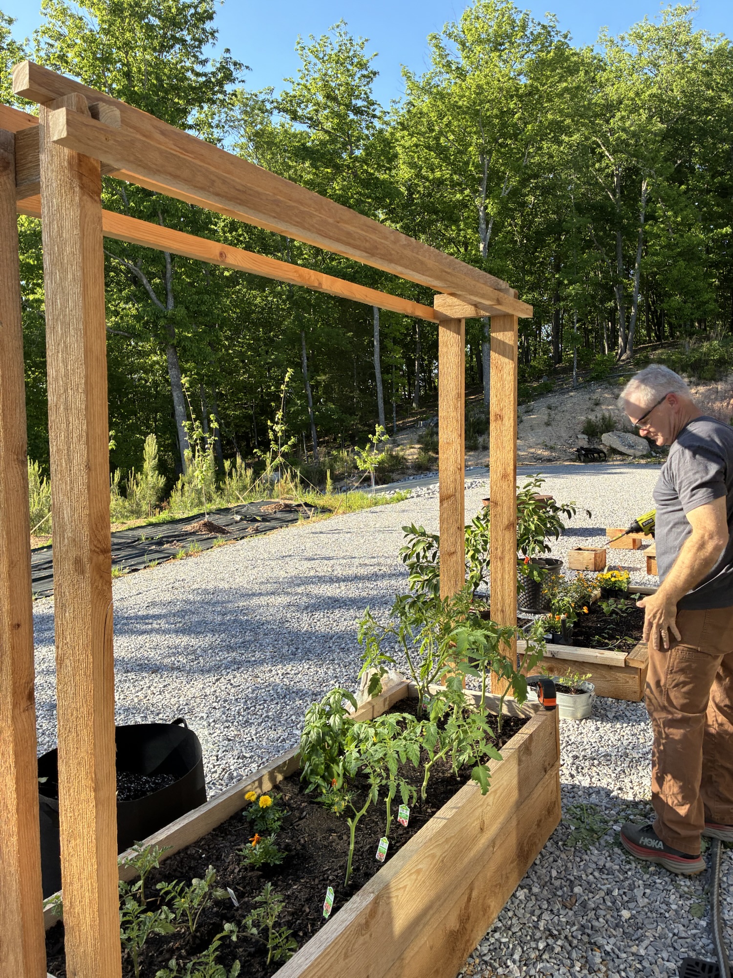 He has been gradually building more boxes as time allows. This year’s boxes include trellises because we are jumping on to the vertical growing bandwagon.